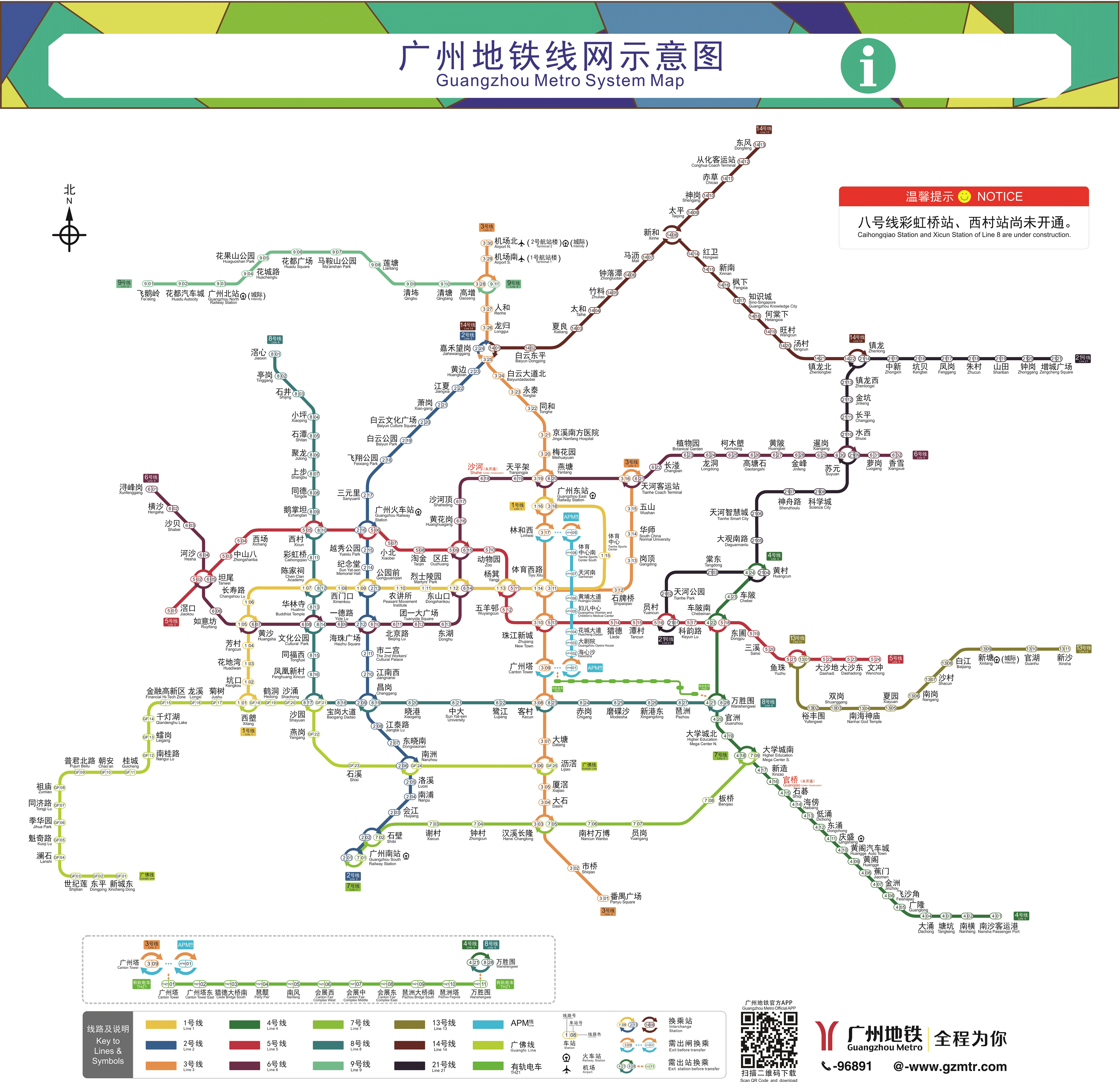 广州有非常完善的地铁网络(点击下图查看大图),其中尤为要注意的是 3 号线,它纵穿广州市中心,是广州最拥挤的线路,被称为“死亡3号线”。为了缓解 3 号线的压力,又在市中心建了 APM 线,APM 线只有两节车厢,没有车头车尾,是无人驾驶的哦。除此之外,广州有一路延珠江行驶的有轨电车,也可以去坐一下。